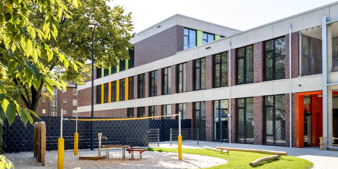 Nach den Entwürfen von agn Niederberghaus & Partner ist das Projekt ein Meilenstein in der Krefelder Bildungslandschaft und eine Bereicherung für das Stadtviertel. Das Konzept: Die Begleitung von Familien von der Geburt bis zum Schulübergang und somit das Angebot einer durchgängig bedarfsgerechten Unterstützung. Der Bau besteht aus einer Kindertagespflege, einem Kindergarten, einer Grundschule sowie einer Sporthalle zur vielseitigen Verwendung.